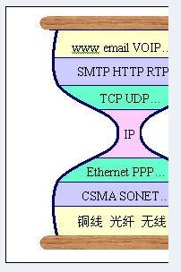 RFC1958和RFC3724等所描述的“端到端的透明性”是Internet一直堅持的為數(shù)不多的Internet體系架構(gòu)的核心設計理念。所謂端到端的透明性,就是在TCP/IP的設計中,將Internet系統(tǒng)中與通信相關(guān)的部分(IP網(wǎng)絡)與高層應用(端點)分離,最大限度地簡化網(wǎng)絡的設計。在有些文獻中也稱其為“沙漏”模型,如圖1。