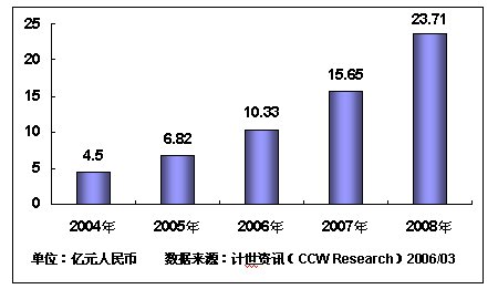 Research)數(shù)據(jù)表明,2005年,我國(guó)移動(dòng)政務(wù)市場(chǎng)規(guī)模達(dá)6.82億元,增長(zhǎng)率為51.6%,預(yù)計(jì)2006年,我國(guó)移動(dòng)政務(wù)市場(chǎng)規(guī)模將達(dá)到10.33億元,預(yù)計(jì)未來三年內(nèi),中國(guó)移動(dòng)政務(wù)復(fù)合增長(zhǎng)率將達(dá)到51.5%,截至2008年,我國(guó)移動(dòng)政務(wù)市場(chǎng)規(guī)模將突破20億元。
