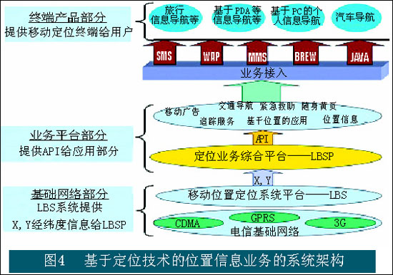 其中在基礎(chǔ)網(wǎng)絡(luò)層面中,LBS系統(tǒng)提供X、Y經(jīng)緯度信息,并把信息傳遞到定位業(yè)務(wù)綜合平臺(tái)。提供不同位置應(yīng)用的平臺(tái)部分通過(guò)接口的方式獲取位置信息,進(jìn)行面向特定業(yè)務(wù)的計(jì)算。終端用戶(hù)通過(guò)移動(dòng)終端并以不同的接入方式獲取位置類(lèi)的信息服務(wù)。