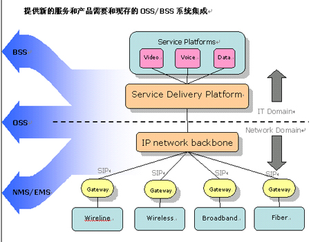 沒有一家電信公司可以花費(fèi)數(shù)年時(shí)間來重新開發(fā)新的服務(wù),服務(wù)提供商在舊的計(jì)費(fèi),開通,網(wǎng)管系統(tǒng)上已經(jīng)進(jìn)行了大量的投資,現(xiàn)存的大量關(guān)鍵系統(tǒng)必須得以重用并平滑過渡到三網(wǎng)合一時(shí)代。