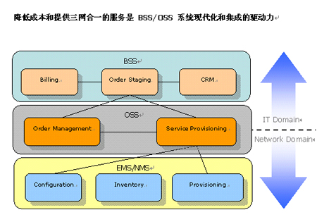 我們可以看到,集成現(xiàn)存的OSS/BSS即 NMS/EMS 是 三網(wǎng)合一的必然要求。 然而傳統(tǒng)的EAI和BPM集成產(chǎn)品是被設(shè)計(jì)成滿足IT部門集成CRM或ERP等應(yīng)用的需要,很少被用于OSS層面,原因很簡單:BSS中的系統(tǒng)多半是單一廠商提供的,只和BSS中的特定應(yīng)用打交道。然而,