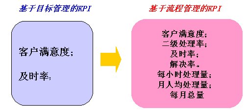 - 基于流程的指標(biāo)是一定可以在流程中可以測量到的,而基于目標(biāo)的KPI不一定。如:以前我們經(jīng)常提到的關(guān)于投訴處理的“一次處理率”指標(biāo),到目前為止,沒有人能解決其測量問題。因此,我們重新定義了可測量的替代指標(biāo)(一級處理率、二級處理率和三級處理率:一級處理率指由前臺話務(wù)人員直接處理的投訴占整個投訴量的比率;二級處理率指由前臺客服中心后臺人員處理的投訴占整個投訴量的比率;三級處理率指由市公司投訴處理人員處理的投訴占整個投訴量的比率)。