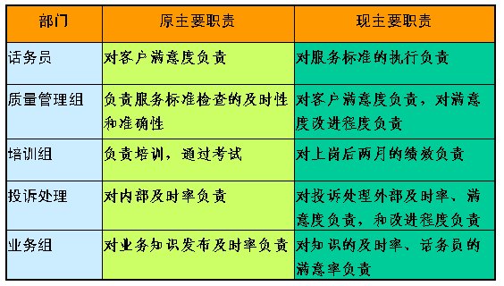 首先,要根據(jù)組織的目標(biāo)來確定我們需要哪些流程,即需要哪些流程才能保證組織目標(biāo)的實現(xiàn);其次,根據(jù)流程的需要,即為了保證流程的有效運行,來劃分不同部分的職責(zé);最后,根據(jù)各部分職責(zé)的劃分來設(shè)置組織的架構(gòu)。如我們根據(jù)客服中心流程運行的需要,對組織架構(gòu)和相關(guān)班組的主要職責(zé)進行了調(diào)整,以保證流程的有效順暢運行。如部分班組的主要職責(zé)調(diào)整如下: