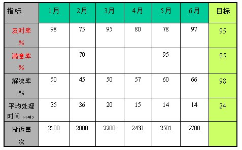 及時率:雖然在6月達到了97%,高于目標(biāo)值95%,但從1-6月份波動的情況來看,其表現(xiàn)為大幅波動,我們認(rèn)為此指標(biāo)處理失控狀態(tài),是沒有管理的或管理是無效的,必須加強管理;