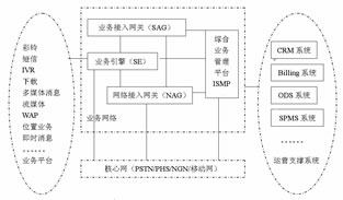 在電信集團(tuán)的統(tǒng)一規(guī)劃下,ISMP和SAG相繼推出。ISMP是綜合增值業(yè)務(wù)管理平臺(tái),ISMP不但可以解決現(xiàn)網(wǎng)固網(wǎng)/PHS業(yè)務(wù)管理的問題,而且可以配合促進(jìn)3G業(yè)務(wù)試驗(yàn)和體驗(yàn),不斷完善,進(jìn)行增值業(yè)務(wù)價(jià)值鏈、業(yè)務(wù)內(nèi)容合作,收集市場需求和完善的增值業(yè)務(wù)應(yīng)用模式,整合和強(qiáng)化現(xiàn)有的市場營銷環(huán)節(jié)。SAG是業(yè)務(wù)接入網(wǎng)關(guān),它包含與業(yè)務(wù)引擎的“業(yè)務(wù)能力驅(qū)動(dòng)”接口,包含與ISMP的“SP/用戶管理”接口,包含對(duì)移動(dòng)和固定網(wǎng)絡(luò)的支持。ISMP、SAG與業(yè)務(wù)平臺(tái)和周邊支撐系統(tǒng)的關(guān)系如圖7所示。