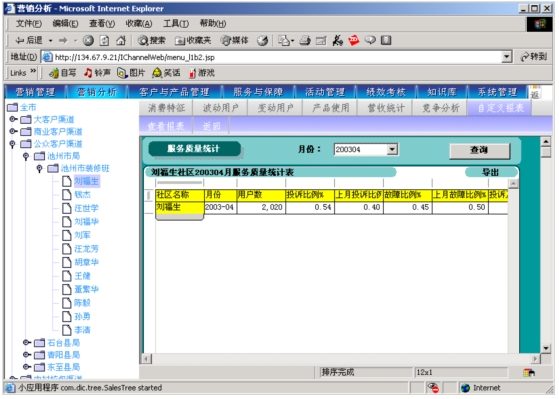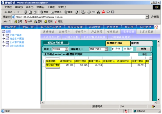 本系統(tǒng)是以市場(chǎng)為導(dǎo)向、客戶為中心、效益為目標(biāo)的電信營(yíng)銷和服務(wù)的支撐系統(tǒng),為企業(yè)經(jīng)營(yíng)服務(wù)和營(yíng)銷戰(zhàn)略提供有力的支撐,通過(guò)對(duì)業(yè)務(wù)收入、業(yè)務(wù)發(fā)展以及市場(chǎng)競(jìng)爭(zhēng)的深入分析,從而達(dá)到留住老客戶、發(fā)現(xiàn)新客戶,了解競(jìng)爭(zhēng)對(duì)手動(dòng)態(tài),及時(shí)掌握市場(chǎng)變化趨勢(shì)的目的。