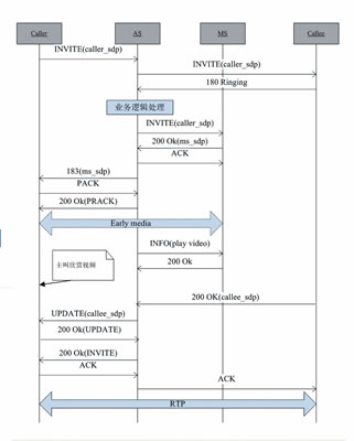 Session Progress 響應(yīng),從而在主叫和MS之間建立早期媒體流。AS向MS發(fā)送指示播放視頻的INFO消息,MS直接向主叫播放定制的精彩視頻。當被叫摘機后,AS收到帶被叫SDP的200