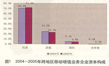 電信增值市場的開放和政策環(huán)境的優(yōu)化,也吸引了眾多的外資企業(yè)。電信增值服務的投資來源、經營主體、服務目標、經濟功能與基礎電信業(yè)務存在明顯差異,彼此間有競爭關系,但更多的是補充、豐富的關系。目前,我國已放開電信增值市場準入,從2005年起,整個電信增值業(yè)務市場就呈現出持續(xù)快速發(fā)展的勢頭,民營資本已經發(fā)展成為電信增值業(yè)務領域的主力軍,其所占企業(yè)數量比例已超過70%(見圖1)。