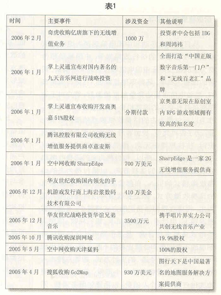 從2003年開始,國內就顯現出并購增值服務運營企業(yè)的苗頭。2004年以來,隨著整治增值服務運營企業(yè)的力度不斷加大,并購漸成風潮(見表1)。2004年2月,新浪收購深圳網興科技公司;2004年5月,搜狐收購手機WAP服務提供商北京吉菲爾公司。2005年,在“超級女生”節(jié)目大獲成功后,掌上靈通宣布將對國內著名的九天音樂網進行戰(zhàn)略投資,全面打造“中國正版數字音樂第一門戶”和“無線百老匯”品牌。各大移動增值業(yè)務服務商通過并購競爭對手,門戶網站可以在移動增值服務領域尋求新的突破,獲得可觀的利益,增強自身的競爭力。伴隨著3G商用的日益臨近和市場競爭的不斷加劇,主流SP(服務提供商)進一步加快了資本購并和業(yè)務整合的步伐,整個SP行業(yè)將加速洗牌。經過市場整合,主流SP將不斷做大做強,而相當多的缺乏市場競爭力的SP將被淘汰出局。