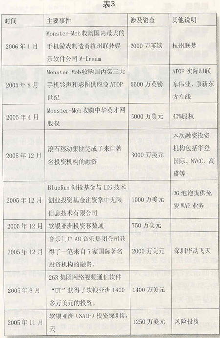 近幾年來,一些資本投資商將投資的重點放到了無線音樂、手機游戲和手機視訊等業(yè)務領域,逐步加大了對SP的投資力度(見表3)。進入2005年以來,著眼于2.5G向3G的全面演進,風險投資對SP的投資力度進一步加大。以滾石移動為例,在2002年和2004年獲得兩輪風險投資之后,滾石移動憑借在無線音樂領域取得的良好市場業(yè)績,又獲得了智基創(chuàng)投、華登國際、聯想投資等公司的投資,投資金額達3000萬美元。繼2004年10月獲得IDG投資以后,2005年12月7日,國內著名的數字音樂門戶——A8音樂集團獲得了包括IDG和Intel投資公司在內的5家國際著名投資機構的投資,投資金額達2000萬美元。同月,掌中無限則獲得了來自全球性風險投資商BlueRun創(chuàng)投基金和IDG總額達上千萬美元的投資。