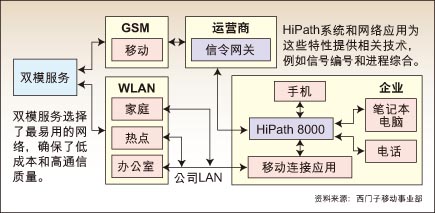 固定/移動(dòng)網(wǎng)絡(luò)融合(FMC)概念已經(jīng)被炒作了兩年之久,其支持者一直都宣稱該技術(shù)可以將手機(jī)和基于室內(nèi)WLAN的無線電話相結(jié)合。今天,供應(yīng)商終于開始部署以特定交換局應(yīng)用為基礎(chǔ)的產(chǎn)品,以及面向手機(jī)的客戶端軟件。西門子移動(dòng)事業(yè)部正在推出針對(duì)統(tǒng)一語音網(wǎng)絡(luò)的Hipath MobileConnect產(chǎn)品,而與此同時(shí),新興企業(yè)Divitas網(wǎng)絡(luò)公司也聲稱,其基礎(chǔ)設(shè)施可以充當(dāng)“移動(dòng)/移動(dòng)融合”的角色。圖:西門子的HiPath MobileConnect系統(tǒng)承諾能夠?qū)崿F(xiàn)真正的FMC。