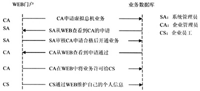 虛擬總機(jī)系統(tǒng)開戶流程采用WEB方式實(shí)現(xiàn),以此完成用戶對虛擬總機(jī)業(yè)務(wù)的定購、系統(tǒng)管理員對用戶開戶申請的審核、用戶業(yè)務(wù)參數(shù)的控制等操作,最后企業(yè)員工可以在企業(yè)管理員許可業(yè)務(wù)后,登陸WEB門戶管理個人信息。具體流程如圖2所示。