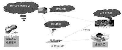 步驟五:如果用戶不知道員工分機(jī)號碼或者希望了解其他信息,主叫用戶可以選擇接入人工秘書臺。此時人工秘書臺會依據(jù)被叫號碼檢索出被呼叫集團(tuán)的信息,同時根據(jù)主叫號碼檢索出主叫用戶是否為企業(yè)內(nèi)部員工或者企業(yè)客戶,同時將這些信息同步更新到人工秘書臺上,話務(wù)員根據(jù)這些信息可以完成作為企業(yè)特色話務(wù)員的服務(wù)工作;