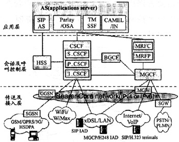 一般IMS分為三層,應(yīng)用層支持各類應(yīng)用服務(wù)器,負(fù)責(zé)為用戶提供增值業(yè)務(wù)和第三方業(yè)務(wù)。會(huì)話及呼叫控制層負(fù)責(zé)管理呼叫或會(huì)話設(shè)置,其中呼叫會(huì)話控制模塊CSCF完成呼叫網(wǎng)關(guān)功能、呼叫業(yè)務(wù)觸發(fā)功能和路由選擇功能,將SIP信令消息正確地轉(zhuǎn)發(fā)到應(yīng)用服務(wù)器。歸屬用戶服務(wù)器HSS用于維護(hù)每個(gè)終端用戶獨(dú)有的業(yè)務(wù)屬性,包括IP地址、漫游信息、好友列表、呼叫業(yè)務(wù)定制信息及語音郵件設(shè)置等。HSS是全網(wǎng)可用資源。媒體資源功能MRF包括MRFP和MRFC,負(fù)責(zé)提供及控制媒體流資源,如播放通知音、媒體流的混合、編解碼等。媒體網(wǎng)關(guān)控制MGCF負(fù)責(zé)PSTN承載與IP流之間的連接,根據(jù)被叫號(hào)碼和來話情況選擇CSCF,并完成PSTN與IMS之間的呼叫控制協(xié)議轉(zhuǎn)換,如將從CSCF接收到的SIP消息轉(zhuǎn)換為MEGACO或ISUP消息,并通過IP發(fā)送到信令網(wǎng)關(guān)SGW。出口網(wǎng)關(guān)控制功能BGCF主要實(shí)現(xiàn)呼叫路由功能,為呼叫選擇適當(dāng)?shù)腜STN接口點(diǎn),若發(fā)現(xiàn)該接口點(diǎn)與自己在同一網(wǎng)絡(luò),則選擇本網(wǎng)絡(luò)的MGCF與PSTN交互,若發(fā)現(xiàn)接口點(diǎn)在另一網(wǎng)絡(luò)時(shí),BGCF將會(huì)話信令轉(zhuǎn)發(fā)給另一網(wǎng)絡(luò)相應(yīng)的BGCF。一個(gè)IMS可以包含一個(gè)或多個(gè)CSCF、HSS、MGCF等功能模塊。傳送及接入層承載各種類型之間的轉(zhuǎn)換,完成與傳統(tǒng)PSTN/PLMN間的互通等功能,包括各類有線接入、無線接入、互聯(lián)互通網(wǎng)關(guān)等設(shè)備。