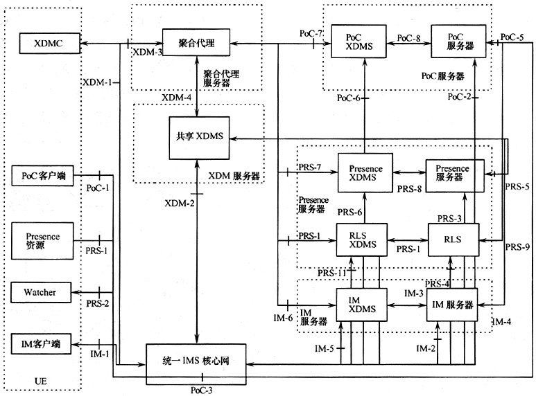 OMA雖然定義了XDM、Presence(呈現(xiàn))、Instant Message和PoC等業(yè)務(wù)的功能實(shí)體和參考點(diǎn),但是為了在網(wǎng)絡(luò)中實(shí)現(xiàn)以上業(yè)務(wù),需要將OMA定義的功能實(shí)體和參考點(diǎn)映射成物理實(shí)體和協(xié)議,確定運(yùn)營(yíng)商開放此類業(yè)務(wù)對(duì)設(shè)備和協(xié)議的要求,圖2給出了一種映射的方式。XDM服務(wù)器包含的共享XDMS功能提供公共群組的能力,有利于用戶在使用PoC、IM等業(yè)務(wù)時(shí)也能共享此群組。