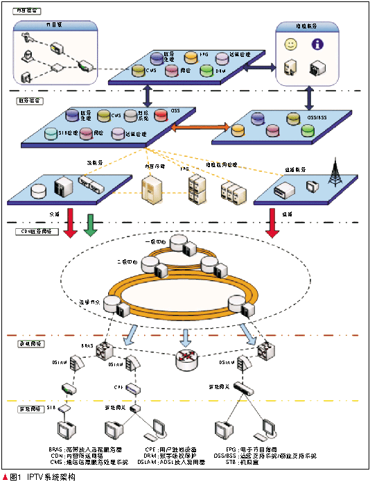 圖1所示為IPTV系統(tǒng)架構(gòu)。IPTV通用系統(tǒng)的邏輯結(jié)構(gòu)由內(nèi)容運(yùn)營平臺、業(yè)務(wù)運(yùn)營平臺、內(nèi)容傳送(CDN)業(yè)務(wù)網(wǎng)絡(luò)、承載網(wǎng)絡(luò)、家庭網(wǎng)絡(luò)5部分所構(gòu)成。