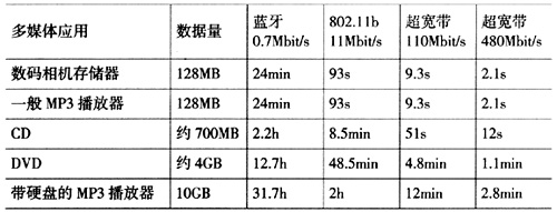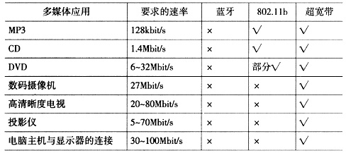 2.0接口相當(dāng),遠(yuǎn)遠(yuǎn)高于無(wú)線局域網(wǎng)802.11b的11 Mbit/s,也比下一代無(wú)線局域網(wǎng)802.11a/g的54 Mbit/s高出近一個(gè)數(shù)量級(jí)。UWB通信的功耗較低,能更好地滿足使用電池的移動(dòng)設(shè)備的要求。另外,UWB信號(hào)的功率譜密度非常低,信號(hào)難以被檢測(cè)到,再加上采用的跳頻、直接序列擴(kuò)頻等擴(kuò)頻多址技術(shù),使非授權(quán)者很難截獲傳輸?shù)男畔,因而安全性非常好。?是一些典型的實(shí)時(shí)多媒體應(yīng)用對(duì)不同無(wú)線傳輸技術(shù)的數(shù)據(jù)傳輸速率的要求。從表中可以看出,如果采用無(wú)線的方式來(lái)進(jìn)行傳輸,只有UWB技術(shù)可以滿足各種應(yīng)用的要求。