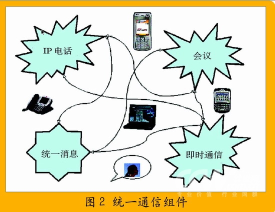 通信的終端可能是桌面電話、計(jì)算機(jī)、手機(jī)或者PDA。這4個部分之間存在緊密的聯(lián)系,比如說電話語音可以轉(zhuǎn)換為統(tǒng)一消息;電話不可達(dá)時,可以采用即時消息溝通或者小組成員可以使用多種方式參與到同一個會議中來等等。而所有這些聯(lián)系可能建立在統(tǒng)一的平臺之上: