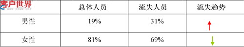 把二組數(shù)據(jù)放在一起比較后我們得出以下結(jié)論:男性座席比女性座席更容易流失,這是因?yàn)楹羧胄偷暮艚兄行膶?duì)座席人員的耐性和承受能力要求較高,相對(duì)而言,男性座席對(duì)這方面的適應(yīng)性較差。