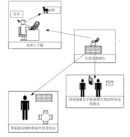 DoCoMo公司網(wǎng)里現(xiàn)有這類手機(jī)共37種),通過無(wú)線方式與免費(fèi)IP包傳輸中繼器相連,免費(fèi)IP包傳輸中繼器通過以太網(wǎng)經(jīng)過寬帶路由器或通過PPPoE(Point