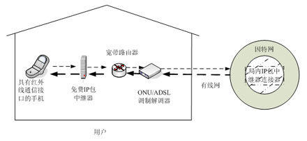 to Point Protocol over Ethernet)方式連接到ONU或ADSL的調(diào)制解調(diào)器上,手機(jī)通過有線寬帶接入網(wǎng)與采用TCP/IP協(xié)議的因特網(wǎng)就連接起來(lái)了,這樣手機(jī)用戶就可去享受免費(fèi)IP包服務(wù)。
