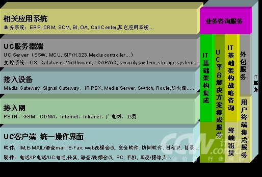 你想通過MSN/QQ直接打電話嗎?你想通過手機(jī)接收電子郵件嗎?在2008年1月24日由計世資訊(CCW Research)主辦的“2008中國統(tǒng)一通信峰會”上,IBM、思科、微軟、Avaya、用友等知名廠商和業(yè)內(nèi)專家向與會者展現(xiàn)了最新的溝通方式,即人們可以在任何時間、任何地點,都可以通過任何設(shè)備、任何網(wǎng)絡(luò)實現(xiàn)自由的溝通。圖表 1統(tǒng)一通信解決方案及相關(guān)服務(wù)全景圖