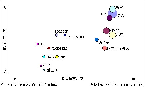 市場競爭非常激烈,但還沒有一個廠商占據(jù)對優(yōu)勢。目前統(tǒng)一通信市場形成了兩類供應(yīng)商的競爭:電信網(wǎng)絡(luò)設(shè)備廠商(如思科、北電)和軟件廠商(如微軟、IBM)。電信設(shè)備廠商的優(yōu)勢集中在硬件產(chǎn)品上,比如路由器、VoIP網(wǎng)關(guān)產(chǎn)品、軟交換設(shè)備;而軟件廠商,像微軟、IBM的優(yōu)勢在于其在電腦桌面上的絕對統(tǒng)治力,幾乎所有的統(tǒng)一通信企業(yè)都需要和微軟、IBM進(jìn)行合作。但從現(xiàn)在的發(fā)展?fàn)顩r來看,各類廠商之間既有競爭又有合作,但還沒有一個廠商占據(jù)對優(yōu)勢。