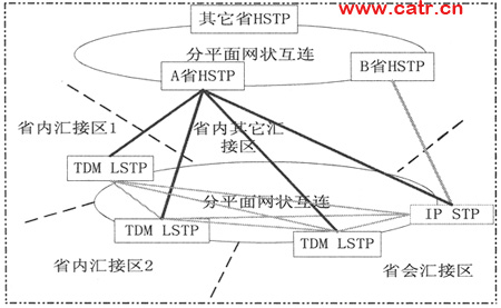 IP STP兼做L/HSTP。IP STP同時(shí)與B省HSTP開通B鏈路。省會(huì)匯接區(qū)到B省的省際長(zhǎng)途業(yè)務(wù)直接通過IP
