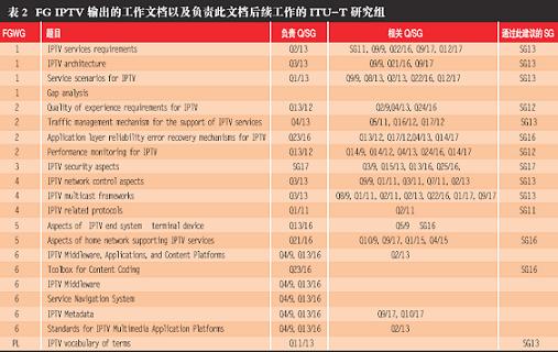 表2 FG IPTV 輸出的工作文檔以及負責此文檔后續(xù)工作的ITU-T
