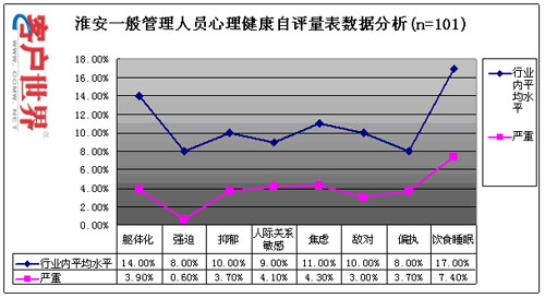 目前,員工壓力和心理健康情況已成為困擾整個行業(yè)的主要問題之一,我們通過專業(yè)方法對淮安中心的員工心理健康和壓力狀況進行了科學(xué)的測量,以了解該中心員工的壓力和心理健康狀況,具體測量數(shù)據(jù)如下: