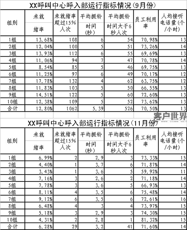筆者所在呼叫中心從今年10月份開始實行“四率管理”,以解決現(xiàn)場管理工作的存在的問題,提高現(xiàn)場管理水平,提高服務(wù)效率。從統(tǒng)計數(shù)據(jù)看(見下表),實行“四率管理”后,呼叫中心的現(xiàn)場管理水平得到大幅提高,服務(wù)指標增長較快。在員工利用率基本保持不變的情況下,未就緒率、平均振鈴時間、每小時接聽電話量等指標均得到有效改善。其中,未就緒率從9月份的12.8%降低到6.3%,未就緒率低于15%的員工人次從1062次降低到29次;平均振鈴時間從5.4秒降低到3.2秒,平均振鈴時間大于6秒的人次從526人次降低到41人次。每小時人均接聽電話數(shù)量從13個提高到14個。按8小時工作計算,每人每天接聽電話數(shù)量增長10個左右。具體統(tǒng)計數(shù)據(jù)見下表。