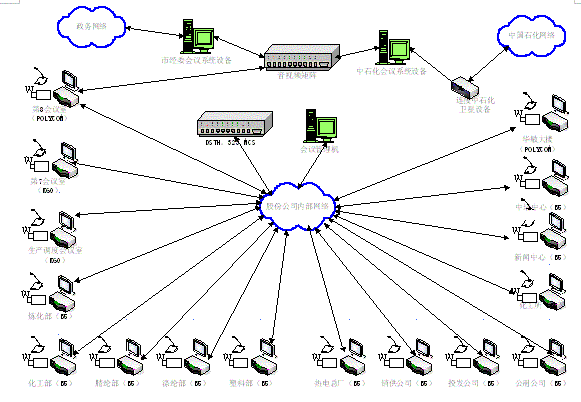 為了提高公司辦公質(zhì)量和效率,加快信息交流速度,保證政令暢通,上海石化決定根據(jù)公司各部門的應(yīng)用需求,依托現(xiàn)有千兆企業(yè)IP網(wǎng)絡(luò)平臺,兼顧現(xiàn)有視頻會議設(shè)備,組建具有一定規(guī)模的視頻會議系統(tǒng)。圖1 視頻會議系統(tǒng)邏輯示意圖