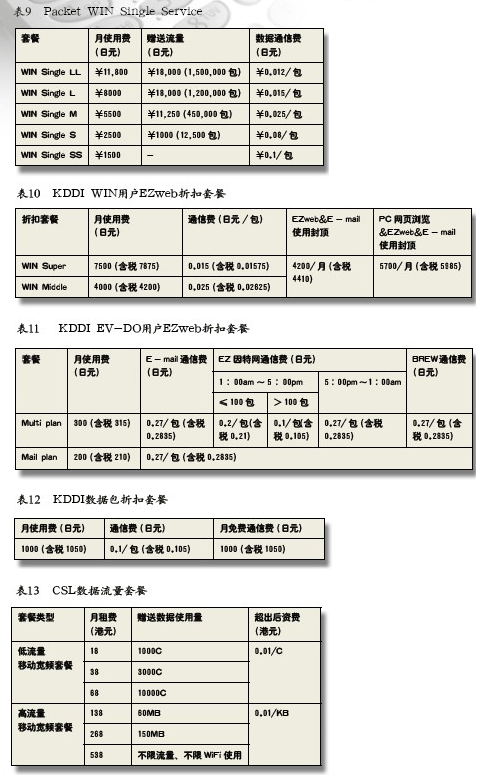 用戶使用WIN au手機(jī),通信包標(biāo)準(zhǔn)計費(fèi)為0.1日元/包(Packet)(含稅0.105日元),其中1Packe=128Bytes。KDDI為用戶提供分檔包月套餐,見表9。