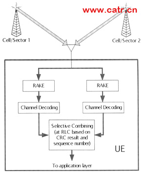 當(dāng)終端用戶移動(dòng)到不同基站下的小區(qū)分界處時(shí)候,采用宏分集技術(shù)同時(shí)接收來(lái)自?xún)蓚(gè)基站的電視數(shù)據(jù)(見(jiàn)圖3)。在實(shí)現(xiàn)宏分集技術(shù)時(shí),要求網(wǎng)絡(luò)側(cè)針對(duì)同一MBMS業(yè)務(wù)在兩小區(qū)間進(jìn)行內(nèi)容同步和一定程度上的時(shí)間同步。