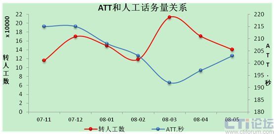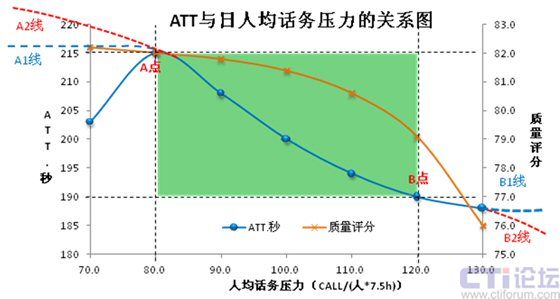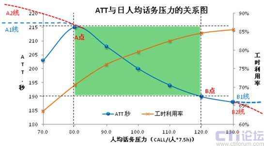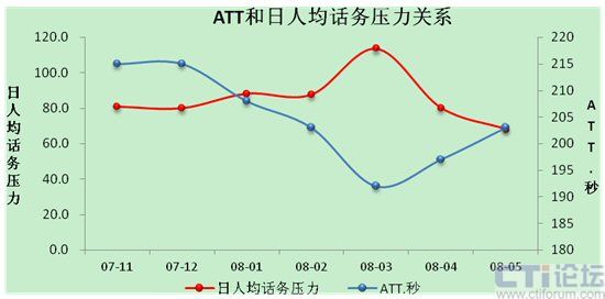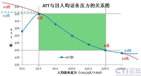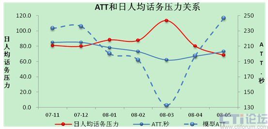 人均話務(wù)壓力在120以上,ATT也沒有依線性明顯縮小,而是在190秒處于一種平緩趨勢;