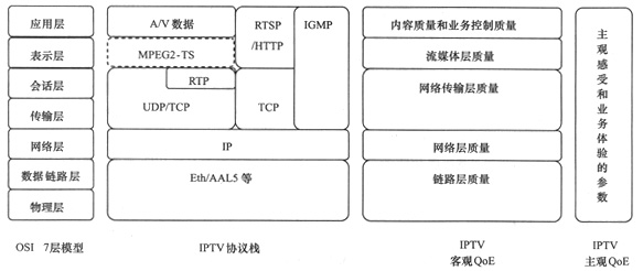 圖2 IPTV業(yè)務(wù)質(zhì)量模型與OSI 7層模型和IPTV協(xié)議棧的關(guān)系