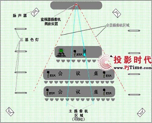 攝像機(jī)放置的最佳位置應(yīng)與監(jiān)視器的位置基本相同,揚(yáng)聲器的位置可放置在會(huì)議室的四角,實(shí)際中常常是掛在四周的墻上。