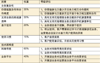 市場上的無線增值業(yè)務(wù)種類繁多,例如短信、手機(jī)鈴聲、手機(jī)游戲和手機(jī)搜索等。這些多種多樣的業(yè)務(wù)一方面豐富了終端用戶的使用需求,另一方面也有效地增加了運(yùn)營商的收入來源,如中國移動的無線增值業(yè)務(wù)在總收入中的比重在不斷地增加,2007年年中這個(gè)比例已經(jīng)超過25%。不過無線增值業(yè)務(wù)的發(fā)展卻并不均衡,有的業(yè)務(wù)推出時(shí)間較長但是卻沒有很好的用戶使用量和收益,另一些業(yè)務(wù)一經(jīng)推出就暴發(fā)性地增長。如何解釋無線增值業(yè)務(wù)發(fā)展的這種不均衡,用什么方法詮釋無限增值業(yè)務(wù)的趨勢,將是解開無線增值業(yè)成功發(fā)展的一把金鑰匙。表1 模型的具體權(quán)重和等級評估原則