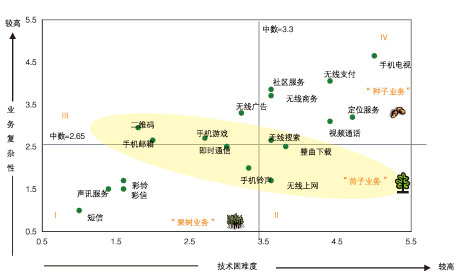 根據(jù)“業(yè)務(wù)復(fù)雜性—技術(shù)困難度”模型,可以清晰地看到一個(gè)業(yè)務(wù)的成功商用和業(yè)務(wù)復(fù)雜性與技術(shù)困難度密切相關(guān),如短信和彩鈴等復(fù)雜性與技術(shù)困難度都很低的業(yè)務(wù)是比較容易成功商用的,將這一類業(yè)務(wù)歸類為“果樹業(yè)務(wù)”,在第一象限(象限I)。還有一些業(yè)務(wù)如即時(shí)通信、整曲下載和無線搜索等業(yè)務(wù),已經(jīng)開始快速增長但是其用戶規(guī)模和收入量都還低于“果樹業(yè)務(wù)”,在業(yè)務(wù)復(fù)雜性與技術(shù)困難度坐標(biāo)中這類業(yè)務(wù)處于4個(gè)象限交匯的中部區(qū)域(即圖中黃色區(qū)域),由于業(yè)務(wù)復(fù)雜性和技術(shù)困難度都會隨時(shí)間而減小,從而這一區(qū)域的業(yè)務(wù)會向第一象限演進(jìn),這類業(yè)務(wù)稱為“苗子業(yè)務(wù)”,即在3年內(nèi)能夠成熟的業(yè)務(wù)。在坐標(biāo)系的右上角第四象限,即業(yè)務(wù)復(fù)雜性和技術(shù)困難度均較高的業(yè)務(wù),稱之為“種子業(yè)務(wù)”,這類業(yè)務(wù)在短期內(nèi)很難快速成長。