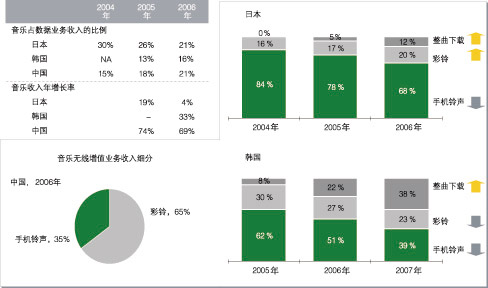 彩鈴在中國倍受青睞并且仍具發(fā)展?jié)摿,在日本和韓國,手機(jī)鈴聲和整曲下載占據(jù)著手機(jī)音樂的主導(dǎo)地位,如圖3所示。