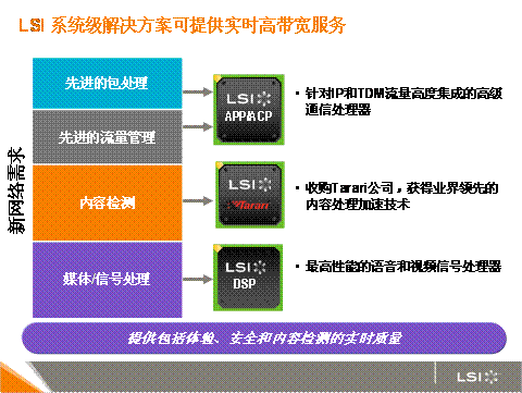 目前,只有很少的技術(shù)專家能夠向移動運(yùn)營商提供推出這些新服務(wù)所需要的世界級解決方案。因?yàn)檫@需要技術(shù)提供者在通信網(wǎng)絡(luò)領(lǐng)域有著深厚的專業(yè)精深技能和高度的系統(tǒng)級解決方案能力。在通信帶寬和實(shí)時(shí)業(yè)務(wù)提供及系統(tǒng)靈活性存在矛盾時(shí),系統(tǒng)設(shè)計(jì)的挑戰(zhàn)變得至關(guān)緊要。 在其他廠商為解決其中任何之一的技術(shù)問題而忙碌的時(shí)候,世界上有哪個(gè)公司可以利用系統(tǒng)的通信處理器綜合設(shè)計(jì)(包括通信1-7層)將帶寬,實(shí)時(shí)和靈活性三者完美結(jié)合,他便是最終的贏家。LSI就是這些少數(shù)技術(shù)專家之一。它能提供一整套解決方案來提供實(shí)時(shí)高帶寬服務(wù),包括高級網(wǎng)絡(luò)通信處理器、內(nèi)容檢測技術(shù)和DSP技術(shù)。