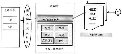 電信各種業(yè)務能力經(jīng)過封裝后以Web Services的方式向外開放,由互聯(lián)網(wǎng)應用調(diào)用這些服務能力,提供基于互聯(lián)網(wǎng)的新型話音型業(yè)務,互聯(lián)網(wǎng)應用提供商作為SP與電信運營商進行收入分成,同時又有大量的CP作為新型話音應用的內(nèi)容提供商加入價值鏈,運營商在價值鏈上充當主導作用。