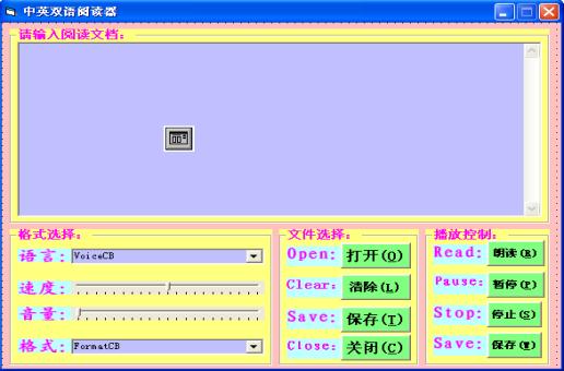 、“清除(L)” 、“保存(T)”和“關(guān)閉(C)” ,分別用來打開要閱讀的文件、清除MainTxtBox中的內(nèi)容、保存MainTxtBox中的內(nèi)容和關(guān)閉中英文閱讀器;在Frame4添加四個Label控件,將它們的Caption分別命名為分別“Speak”