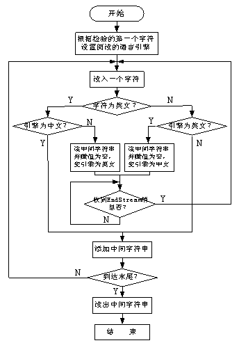 Sam,這樣就實現(xiàn)了中英文混合文本的朗讀。具體的解決方案是:依序處理文本中每個字符,判斷字符中含有的中英文類型,若類型與前一字符相同則添加至中間變量,否則朗讀中間變量文本并保存當(dāng)前位置,接著切換引擎。文本朗讀結(jié)束,發(fā)出EndStream消息,從當(dāng)前位置繼續(xù)循環(huán)。其流程圖如圖4所示。