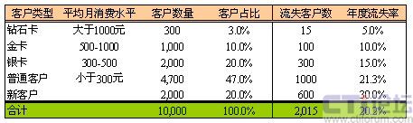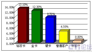 因?yàn)楦叨丝蛻粼诶麧?rùn)貢獻(xiàn)中所起的巨大作用,通過簡(jiǎn)單的計(jì)算即可得出,每一名鉆石卡客戶流失帶來(lái)的利潤(rùn)損失,相當(dāng)于9.4名銀卡客戶流失帶來(lái)的損失,或相當(dāng)于50名普通客戶流失帶來(lái)的損失,或相當(dāng)于125名新用戶流失帶來(lái)的直接損失。