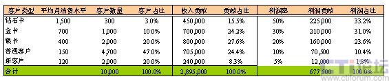 同時(shí),如下表2所示,我們給定了不同客戶分群的客戶平均月消費(fèi)水平及利潤(rùn)貢獻(xiàn)比率。通過計(jì)算可以得出,高端的鉆石卡客戶雖然僅占客戶數(shù)的3%,貢獻(xiàn)了收入的15.5%,卻貢獻(xiàn)了三分之一的利潤(rùn)。而占近半數(shù)的普通客戶,大約貢獻(xiàn)了收入的四分之一,僅僅貢獻(xiàn)了利潤(rùn)了10%左右。在一些行業(yè)中,服務(wù)和交易成本所占比重較高,普通客戶群甚至有可能會(huì)帶來(lái)負(fù)利潤(rùn)。