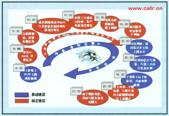 隨著軟交換、IMS等技術(shù)的逐步成熟、寬帶IP接入的發(fā)展、用戶對(duì)業(yè)務(wù)的需求、運(yùn)營商向全業(yè)務(wù)的轉(zhuǎn)型等多種因素影響,固定移動(dòng)融合(FMC)又重新成為電信業(yè)的熱點(diǎn)問題。本文從分析固定移動(dòng)融合(FMC)的驅(qū)動(dòng)力、特點(diǎn)及影響因素入手,提出了運(yùn)營商在FMC趨勢(shì)下的發(fā)展策略。圖1 一個(gè)白領(lǐng)一天的電信服務(wù)需求