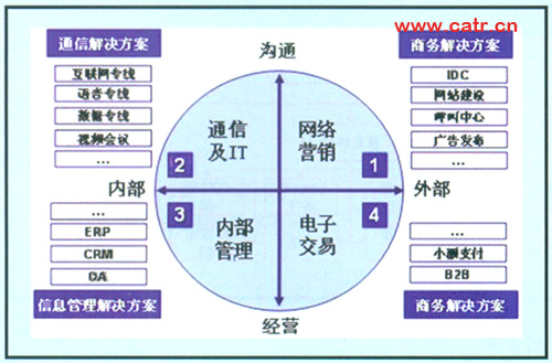 企業(yè)客戶對(duì)電信服務(wù)的需求,集中體現(xiàn)為實(shí)現(xiàn)企業(yè)商業(yè)過程的綜合通信信息整體服務(wù),具體可以按縱向溝通、經(jīng)營和橫向內(nèi)部、外部分為四部分:內(nèi)部員工溝通、內(nèi)部經(jīng)營管理、外部客戶營銷以及產(chǎn)品銷售實(shí)現(xiàn)。與之相對(duì)應(yīng)的需求如圖2所示。
