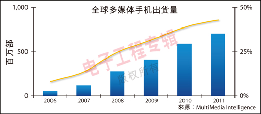 圖2:各地區(qū)的多媒體手機(jī)出貨情況(2006-2011)