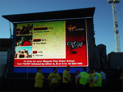 比如,某些公司可能會(huì)使用上面所述的調(diào)節(jié)型文本信息收發(fā)方式來(lái)顯示滾動(dòng)的帶狀區(qū)內(nèi)容,但也會(huì)在文本顯示的過(guò)程中覆蓋某張由手機(jī)用戶拍攝的圖象。這張圖片一般可能是該用戶的貓或狗,然后加上一些有趣的元素。在戶外活動(dòng)中,我們可以用拍到的圖象來(lái)加強(qiáng)文本信息。比如,活動(dòng)現(xiàn)場(chǎng)可以就屏幕上的一張照片提問(wèn)“他夠不夠火辣?”。這樣的問(wèn)答結(jié)果隨后就可以被實(shí)時(shí)廣播到屏幕上。